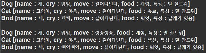 System.out.println("Dog [name : " + getName() + ", cry : " + getCry() + ", move : " + getMove() + ", food : " + getFood() + ", 특성 : " + getDogsp() + "]");