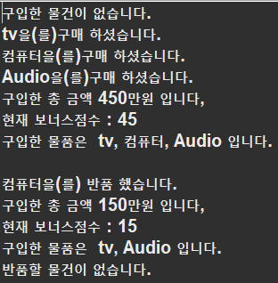 System.out.println("구입한 총 금액 " + sum + "만원 입니다,");