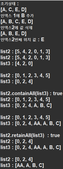 System.out.println("list2.containAll(list3) : " + list2.containsAll(list3)); // list2.containsAll(list3) : list2안에 list3의 요소가 있는가 return : boolean